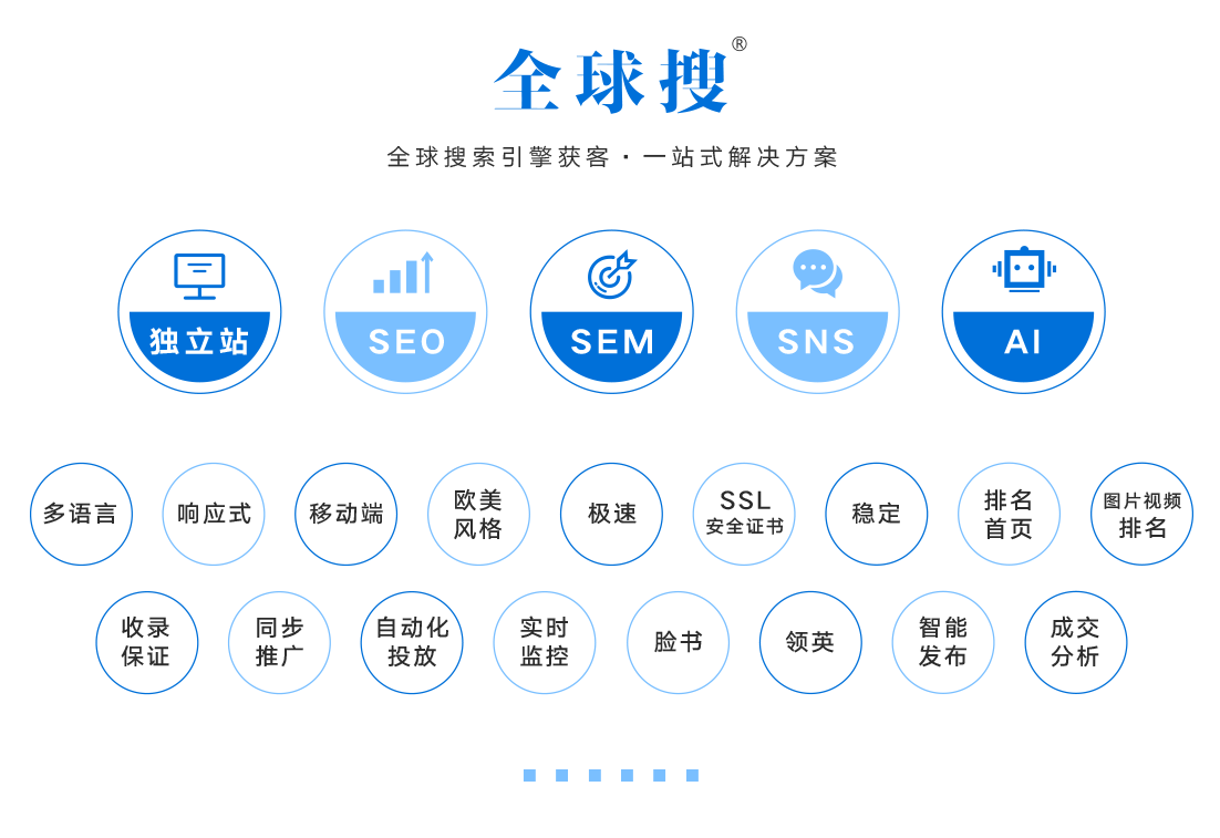 全球搜,是以SaaS平臺架構(gòu)為基礎(chǔ)進(jìn)行外貿(mào)建站、以谷歌搜索引擎為核心進(jìn)行優(yōu)化推廣的— —全球搜索引擎獲客·一站式解決方案!